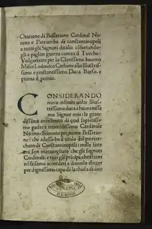 - Ludwig Mohler: Kardinal Bessarion als Theologe, Humanist und Staatsmann. 3 Bände. Schöningh, Paderborn 1923–42 (Quellen und Forschungen aus dem Gebiete der Geschichte 20, 22, 24), (Nachdruck: Scientia-Verlag, Aalen 1967).