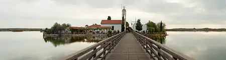 На мальовничому острові посеред озера діє храм Святого Димитрія, який відноситься до подвір'я афонського монастиря Ватопед.