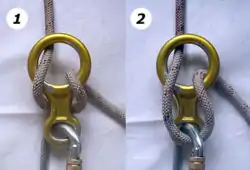 - При швидкісному (спортивному) спуску мотузка проводиться через карабін (див. ілюстрацію 2).