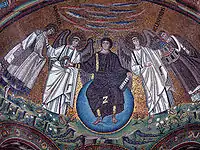 ![]() Другий зліва на мозаїці VI століття з базиліки Сан-Вітале | |