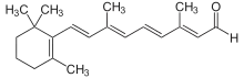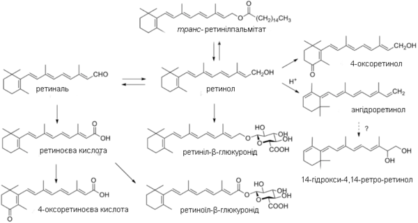 | Метаболізм | Потрапляє до організму в основному в формі пальмітату та ацетату ретинолу та провітамінів — каротинів. Депонується в печінці (у вигляді естерів), частково перетворюється на активні метаболіти — ретиналь (альдегідна форма) та ретиноєву кислоту. |