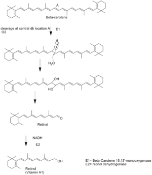 β-каротин спочатку розщеплюється 15—15'—монооксигеназою (посередині молекули) з утворенням ретиналю , а потім — редуктазою за участю коферментів NADH і NADPH. Одночасне вживання з їжею антиоксидантів перешкоджає окисненню каротину по периферичних подвійних зв'язках. Вітамін B12, підвищує активність монооксигенази. Це збільшує кількість молекул каротину, що розщеплюються по центральному зв'язку, й ефективність синтезу вітаміну A зростає в 1,5—2 рази[1].