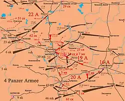 - 46-й мотокорпус — 10-та танкова та 2 дивізія «Дас Райх»; прямував на Могильов;