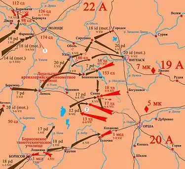 - 47-й мотокорпус — 17-та та 18-та танкові дивізії, услід за ними й 29-та мотопіхотна дивізія; рухається в напрямі Орші.