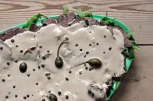 Для подачі м'ясо нарізають тонкими скибочками, викладають на блюдо, заливають великою кількістю соусу і ставлять у холодильник ще на півгодини перед подачею[3]. Зверху страву декорують каперсами.