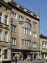 - Будинок Празького кредитного банку на проспекті Свободи, 17. Проєкт посів перше місце серед 16 претендентів на конкурсі 1911 року. Співавтор Владислав Дердацький.[22] Під час реалізації проєкт перероблено архітектором Матеєм Блєхою. Скульптурне оздоблення виконав Емануель Кодет. Того ж року львівський архітектор Збіґнєв Брохвіч-Левинський в журналі Czasopismo Techniczne розкритикував переробку первинного проєкту. Нині тут знаходиться львівське відділення «Промінвестбанку»[23].