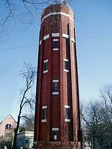 - Водонапірні вежі на вулиці Пасічній та поблизу парку Залізна Вода. Спорудженню передували кілька ескізних проєктів. Через значне падіння цін на цеглу обрано варіант із нетинькованими фасадами з червоної цегли. Застосовано залізобетонні елементи. Зовні вежі мають форму дванадцятигранників із пілонами на кутах. Обладнані оглядовими майданчиками. Статичні обчислення зробив інженер Адам Курилло. Реалізовано у 1932–1933 роках.[33][34]
