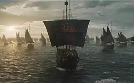 ![]() Дейнеріс Таргарієн направляється у Вестерос, щоб завоювати Залізний Трон. Дейнеріс Таргарієн направляється у Вестерос, щоб завоювати Залізний Трон. | |||||