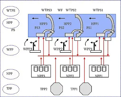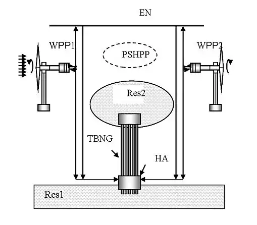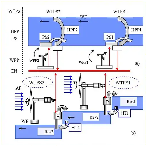 При роботі вітротурбінних гідроакумулюючих електростанцій WТPS1, WТPS2, зведених на каскаді ГЕС HPP1 та HPP2, потрібно враховувати енергетичні параметри як кожної окремої структури, наприклад, вітрових електростанцій WPP1, WPP2, так і взаємний вплив електростанцій на