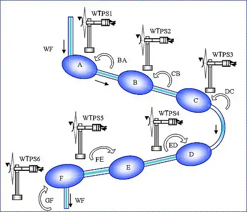 заповнюваність водосховищ водою. Зокрема, необхідно контролювати: вільні об’єми VA, VB, VC, VD, VE у водосховищах A, B, C, D і E; наявність в них води для перекачування; швидкість вітру vBA, vCB, vDC, vED, vIE в акваторіях різних ГЕС та швидкість заповнювання водосховищ (продуктивність водоперекачуючих систем PS) QBA, QCB, QDC, QED, QIE. Тобто, робота вітротурбінних гідроакумулюючих електростанцій каскаду має бути синхронізована. Вплив нестабільності вітру на акваторіях електростанцій на своєчасність заповнювання водосховищ може бути подолано, наприклад, використанням надлишків електроенергії в електричній мережі у нічний час для заповнення проблемних об’ємів. Система автоматичного регулювання має забезпечувати максимальне заповнення басейнів, розташованих вище по руслу, бо згодом вода «спрацьовує» через всі нижні водосховища каскаду.