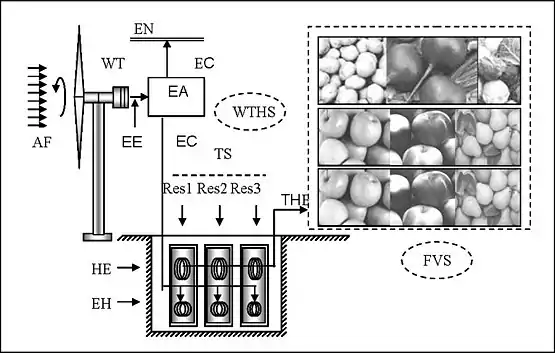 Базова схема вітротурбінної системи електро- й теплопостачання (вітряної теплоелектростанції) для автономного енергозабезпечення фрукто-овочесховища включає вітроенергетичну установку WT, електричний адаптер EA, підземний акумулятор тепла TS, електричні нагрівачі ЕH, теплообмінники ТE. Вітротурбінна система енергопостачання може працювати в двох режимах: виробництва електроенергії ЕЕ та виробництва й акумулювання теплової енергії ТНE.
