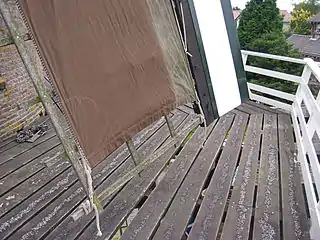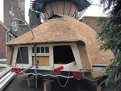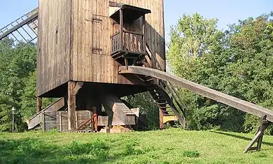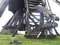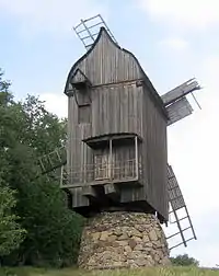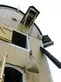 Вигляд ззаду стовпового вітряка. Видно двері з балкончиком і дашок підіймача.