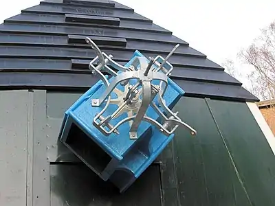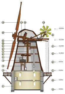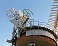 З тильної частини шатра деяких вітряків знаходиться маленький вітрячок — віндроза[14] (від нім. Windrose — «роза вітрів»), «вітрякова вертушка» (англ. windmill fantail, нім. Windrichtungsnachführung, у Словнику Брокгауза і Єфрона описується як «напрямне чи рульове колесо»), площина обертання якого перпендикулярна площині обертання крил. Він призначений для забезпечення орієнтації вітряка по вітру: коли вітер змінюється, вертушка-віндроза починає обертатися і своїм механізмом повертає шатро (чи весь вітряк) крилами проти вітру[15][16]. Повертання здійснюється через кремальєру шатра на шатрових вітряках, через колеса в основі («стільці») на стовпових (хоча на останніх цей механізм застосовується рідко). Вісь вертушки укріплена між двома виносними балками, передачею з двох корончастих коліс вона з'єднується з паралельним балкам валом, який у свою чергу, передає обертання на гвинт-черв'як, теж закріплений між балками, але в безпосередній близькості до шатра. Він обертає шестірню вала, друга шестірня якого повертає шатрову кремальєру (на наведеному малюнку черв'ячний гвинт розташований безпосередньо на осі віндрози). Обертання кремальєри можна проводити й вручну, за допомогою коловорота із зубчастою передачею всередині шатра.
