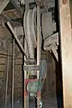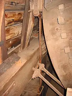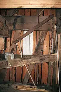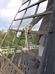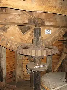 - Гальмо з брусом-противагою — один кінець «хомута» прикріплений нерухомо до балки, другий з'єднується через металеву тягу з масивним брусом-противагою, одним кінцем закріпленим на шарнірі біля передньої стінки вітряка, а другим підвішеним на мотузку через рухомий блок (часто і через важелі). Кінець мотузка від блока кріпиться на барабані коловорота, на більший барабан якого намотано ще один мотузок. Коли мотузок не натягнутий, брус перебуває в опущеному положенні і тягою притискує колодки до обода. Для початку роботи тягнуть за мотузок, підіймаючи блоком брус і розтискуючи колодки. Для гальмування ослабляють кінець мотузки і брус опускається, внаслідок чого хомут-гальмо обтискує гальмове колесо і вимушує його зупинитися. Якщо ваги бруса недостатньо для гальмування, на нього навішують вантаж[13].