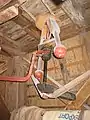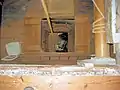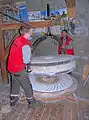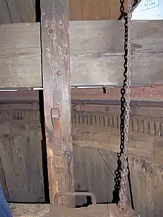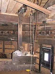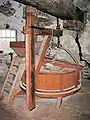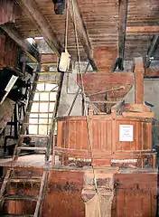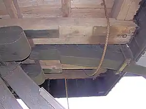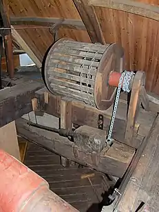 Посад і дерев'яний кран з металевим захватом (вовчою лапою) для монтажу/демонтажу млинових каменів