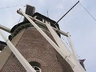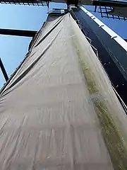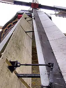 Крила досконалішої конструкції можуть змінювати вітрильність. Для цієї мети обшивка їх складена з окремих щитків, кожен з яких повертається на осі за допомогою важелів. Кінці важелів з'єднані спільною тягою, що йде паралельно рамену. Кінці тяг сходяться у втулці, де за допомогою особливого пристрою, «павука» (нід. spin), приєднуються важелями до стрижня, який проходить усередині порожнистого крилового вала. Задній кінець стрижня з'єднаний із зубчастою рейкою, що зчіплюється із зубчастим сектором, на осі якого закріплений передній кінець довгого важеля, винесеного назовні будівлі вітряка. Вище вихідного прорізу важеля на шатрі розташована вантажна стріла, через блок якої проходить довгий мотузок, кінці якого спускаються донизу, і до одного з них кріпиться задній кінець важеля. Унизу до кінців мотузка причіплюють тягар, зміною ваги якого можна регулювати швидкість обертання вала. Механізм працює за принципом зворотного зв'язку: коли тиск вітру на стрижень зменшується, він повертає сектор і опускає важіль, тягар повертає щитки перпендикулярно до вітру; якщо ж тиск вітру збільшується, важіль підіймається і повертає щитки ребром до вітру[13].