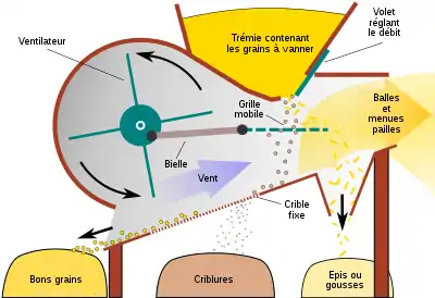 Проста віялка складається з вентилятора (вертушки, крилача), що закріплений на горизонтальній осі і приводиться в дію ручним приводом через шестірню, встановленого над вертушкою коша для зерна, кількох решіт, одно чи кількох ящиків для відсортованого зерна, ящика для домішок. Зерно з домішками (ворох)[11] висипається з коша перед вертушкою, потік повітря відносить полову, а зерно вдаряється о щит і падає в ящик. Для більш ретельного очищення (а також сортування зерна) застосовують систему решіт, встановлених під кошем: вічка нижнього найдрібніші, верхнього — найбільші. Решетам надається поступальний рух за допомогою кривошипно-шатунного механізму. Під решетами встановлений ящик для дрібного зерна, у передній (встановлений під кошем) падають великі домішки, відсіяні на найвищому решеті, а дорідне зерно падає в задній ящик[3].