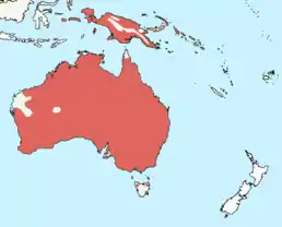 Вид поширений в Австралії, Нової Гвінеї, на сході Індонезії, Соломонових островах та архіпелазі Бісмарка. Його природним середовищем існування є субтропічні або тропічні вологі низинні ліси та субтропічні або тропічні мангрові ліси.