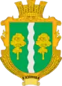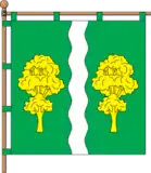 Квадратне полотнище розділене хвилясто вертикально на зелену, білу і зелену смуги у співвідношенні 9:2:9. На зелених смугах по жовтому в'язу.