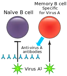 Після інфікування багато В-клітин диференціюються в плазматичні клітини (також відомі як ефекторні В-клітини) які виробляють першу хвилю захисних антитіл і допомагають усунути інфекцію.[6] [2] Плазматичні клітини виділяють антитіла, специфічні для патогенів, але вони не можуть реагувати на повторне інфікування. Частина В-клітин з BCR, споріднених з антигеном, диференціюється в MBC, які довго зберігаються в організмі.[12] MBC можуть підтримувати експресію своїх BCR і зможуть швидко реагувати на повторну зустріч з патогеном.[6]