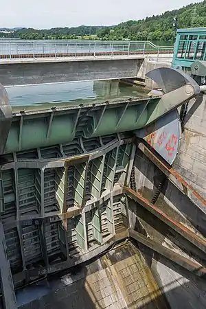 У правобережній (південні) частині греблі споруджено три водопропускних шлюзи, а біля лівого берегу розміщено машинний зал із двома турбінами типу Каплан, виготовленими компаніями Andritz та Escher-Wyss. Генератори для ГЕС поставлені компанією Siemens-Schuckert. В підсумку це обладнання забезпечує річне виробництво біля 400 млн кВт-год.