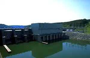 Інтегрований у греблю машинний зал обладнаний двома турбінами типу Каплан загальною потужністю 79 МВт.