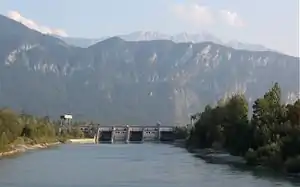 Для спорудження ГЕС річку перегородили бетонною греблею висотою 36 метрів та довжиною 88 метрів.[1] Це створило підпір, що відчувається протягом 9,8 км до устя притоки Інну Weissache. При цьому для захисту прибережних територій на лівому березі відсипали 6 км, а на правому 4 км дамб. Також з німецького боку працює одна, а з австрійського дві насосні станції для відкачування води, яка фільтрується через перепону.