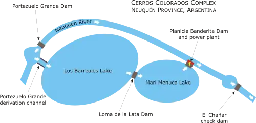 Електростанція є частиною комплексу Серрос-Колорадос (ісп. Complejo hidroeléctrico Cerros Colorados), що включає чотири насипні греблі та три водосховища. Перш за все долину Неукену перекриває гребля Portezuelo Grande, яка має висоту 12 метрів, довжину 3250 метрів та потребувала 500 тис. м3 матеріалу. Вона утримує сховище з доволі значною площею поверхні та невеликим об'ємом — 39 км2 та 10 млн м3 відповідно, а головною задачею греблі є відведення ресурсу до розташованих на правобережжі річки великих водойм.