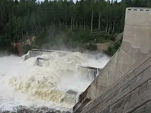 Річку перегородили греблею, яка включає два водоскидні шлюзи та машинний зал. Останній обладнаний трьома турбінами типу Каплан загальною потужністю 149 МВт, які працюють при напорі 32,4 метра.