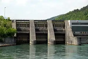 У правобережній частині греблі обладнано три водопропускних шлюзи, а біля лівого берегу розміщено машинний зал із двома турбінами типу Каплан, виготовлених компаніями Chamilles Maschinenbau та Voest Alpine. Генератори для ГЕС поставлені компанією AEG. В підсумку при напорі у 27 метрів це забезпечує річне виробництво на рівні 351 млн кВт-год.
