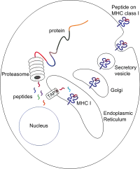 Пептиди в основному генеруються в цитозолі протеасомою. Протеасома — це макромолекула, що складається з 28 субодиниць, половина з яких має протеолітичну активність. Протеасома розкладає внутрішньоклітинні білки до дрібних пептидів, які потім вивільняються в цитозоль. Протеасоми також можуть зшивати окремі фрагменти пептидів (так звані сплайсивані пептиди), утворюючи послідовності, які не є суміжними і, отже, не мають лінійної матриці в геномі. Походження сплайсованих пептидних сегментів може бути від одного білка (цис-сплайсинг) або різних білків (транс-сплайсинг).[7] [8] Пептиди повинні бути переміщені з цитозолю в ЕР, щоб там зустріти молекулу MHC класу I, чий сайт зв’язування пептидів знаходиться в просвіті ЕР.