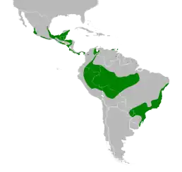 Вид поширепний в Центральній та Південній Америці від Мексики до Аргентини. Мешкає у нижньому ярусі вологих лісів і лісових узліссях, лісистих річкових берегах і зарослих просіках