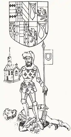 ![]() Гі де Бошан, 10-й граф Ворік, стоїть над трупом Гавестона. Малюнок XV століття. | |