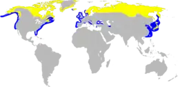 Гніздиться на півночі Європи, Азії і Північної Америки. У Західній Європі це: Норвегія, Фінляндія, Швеція, Північна Ірландія, Північна Шотландія, Ісландія, Гебридські, Оркнейські, Шетландські й Фарерські острови, Шпіцберген, Ведмежий острів. У Північній Америці: арктичні острови і материкова частина Канади на південь до 50-ї паралелі, Аляска, узбережжя Гудзонової затоки, півострів Лабрадор, Ньюфаундленд, прибережні райони Гренландії. У колишньому СРСР: архіпелаги Земля Франца-Йосифа і Нова Земля, острови Колгуєв, Вайгач, Новосибірські острови, Острів Врангеля, Курильські острови (Парамушир і Симушир), Командорські і Шантарські острови, на материку в північній частині країни від Прибалтики (Латвія, Естонія) і Кольського півострова (включаючи прилеглі Айновські острови і Сім островів) до Чукотського півострова, Камчатки і узбереж Охотського моря. Південна межа гніздового ареалу вивчена недостатньо. Гніздування відмічене у Вологодській області (62° пн. ш.), на Обі поблизу Березово (67° пн. ш.), у басейні Тазу (63° пн. ш.), у басейні Єнісею під 59° пн. ш., можливо, в північному Прибайкаллі, у басейні Вілюя, близ Якутська, на озері Кізі в нижній течії Амура. Гніздування в південній половині ареалу, ймовірно, спорадичне і нерегулярне. Історичні зміни ареалу, якщо вони були, мабуть, незначні.