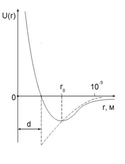 Сили міжмолекулярної взаємодії залежно від віддалі між молекулами можуть бути силами притягання або силами відштовхування. Молекулярні сили притягання називають силами Ван дер Ваальса (Йоганнес Ван дер Ваальс — нідерландський фізик). Із рисунка видно, що для великих відстаней між молекулами, коли густина газу мала, сили Ван дер Ваальса правильно передають характер взаємодії між молекулами. Частині кривої, яка відповідає міжмолекулярному відштовхуванню, у моделі Ван дер Ваальса відповідає додатна частина кривої. На цій ділянці U(r)→ ∞ при r ≤ d, тобто центри молекул не можуть наблизитись на відстань r < d (d — діаметр молекули). Загалом, зображена пунктиром крива подає потенціальну енергію парної взаємодії молекул, між якими діють сили притягання, а сили відштовхування проявляються лише у разі зіткнення згідно з моделлю твердих кульок.