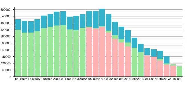 Середній разовий наклад (синій), частка розповсюдження в роздріб (зелений) та загальні продажі (рожевий)[107][108]: