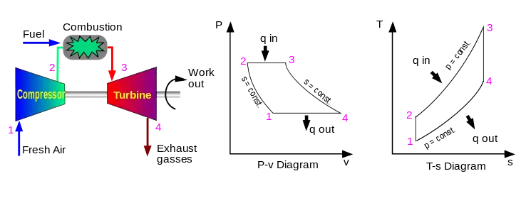 Газові турбіни описуються термодинамічним циклом Брайтона, в якому спочатку відбувається адіабатичне стиснення повітря, потім спалювання при постійному тиску, а після цього здійснюється адіабатичне розширення знову до стартового тиску.