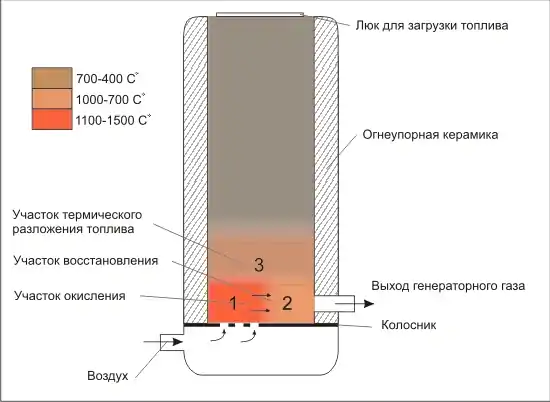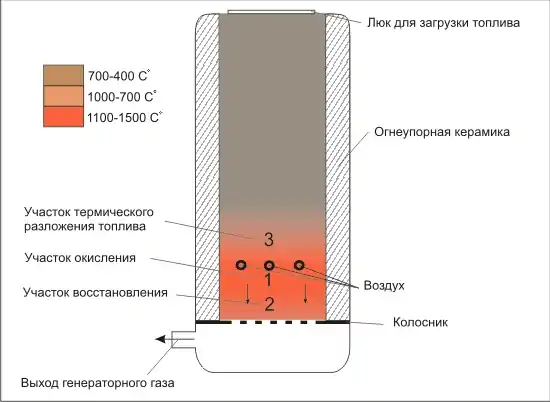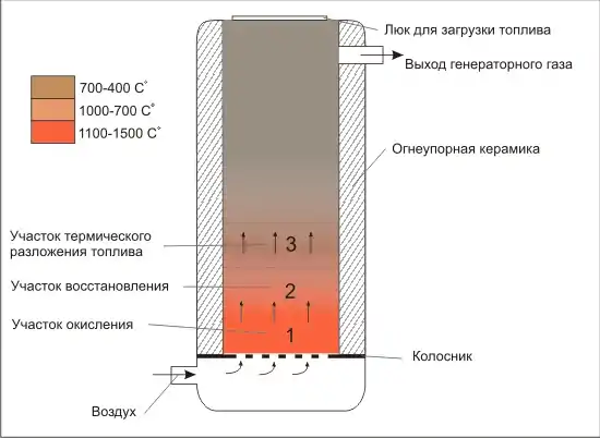 Активна частина газогенератора складається з трьох перетікаючих ділянок: термічного розкладання палива, окиснення, відновлення. Крім пристроїв із зовнішнім підводом тепла, де зони окиснення нема.