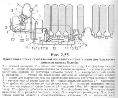 Вісім балонів, згрупованих по чотири, розміщують під платформою кузов(рами) а й кожну групу обкладають вентилем, що дає змогу витрачати газ у будь-якій групі або відразу в обох. Газом балони наповнюються крізь вентиль (10). Із балонів газ крізь витратні вентилі (9) і (14) надходить у підігрівник (18), що призначається для захисту системи від замерзання внаслідок великого зниження температури газу під час його розширення в редукторі високого тиску (20). Між підігрівником газу, що обігрівається теплотою відпрацьованих газів, і балонами встановлено основний витратний вентиль. На редукторі високого тиску (20) установлено датчик контрольної лампи, яка засвічується в разі заниження тиску газу в редукторі до значення менше ніж 0,45 мПа. Це сигналізує водієві про те, що газу в балонах залишилося на 10...12 км. Із редуктора (20) газ надходить в електромагнітний клапан (6) із фільтром. Цей клапан відкривається під час пуску двигуна, і газ трубкою (7) надходить у редуктор низького тиску (3). Редуктор (3) має два ступені й знижує тиск газу, що надходить у карбюратор — змішувач, майже до атмосферного, дозує газ для приготування суміші потрібного складу й вимикає газову лінію в разі зупинки двигуна. Під час роботи двигуна газ надходить у карбюратор — змішувач (21), а в режимі холостого ходу — шлангом безпосередньо в за дросельний простір. Робота двигуна на бензині забезпечується стандартною системою живлення бензином, яку підключено до карбюратора — змішувача (21).