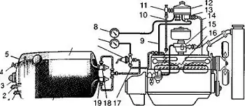 З балона(5) крізь витратний вентиль(19), магістральний вентиль(6) і газопровід(17) стиснений газ надходить у випарник(16), що обігрівається рідиною з системи охолодження двигуна. Потім крізь фільтр(11) газ надходить у редуктор(12), де його тиск зменшується майже до атмосферного. Контролюють робочу системи за допомогою манометрів.Пуск і прогрівання двигуна здійснюють на паровій фазі газу. Для цього відкривають паровий(18) і магістральний(6) вентилі. На короткий час двигун зупиняють вимиканням запалювання, а в разі зупинки на 1 .2 год. перекривають магістральний вентиль.