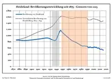 Динаміка населення з 1875 року в сучасних кордонах (Синя лінія: населення; Пунктир: відносна порівняльна динаміка населення землі Бранденбург; Сірий фон: період Третього рейху; Помаранчевий фон: період НДР)