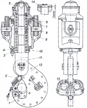 У гакоблоках гак з'єднується зі щоками талевого блоку за допомогою осей 8, які установлені в кишенях його корпуса і закріплені стопорними планками. Талеві блоки із сергою з'єднуються з гаком за допомогою стропа, що встановлений на осях у кишенях корпуса гака. При роботі з двохсекційними талевими блоками бурильна колона при спуско-підіймальних операціях підвішується до автоматичного елеватора, який в комплексі АСП замінює гак. При бурінні свердловини вертлюг приєднується до автоматичного елеватора за допомогою додаткової підвіски.