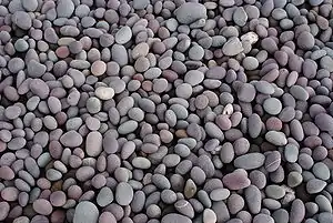 ![]() Галечник, складений галькою кварциту. Галечниковий пляж біля Бозінгтона, Західний Соммерсет, Англія | ||||