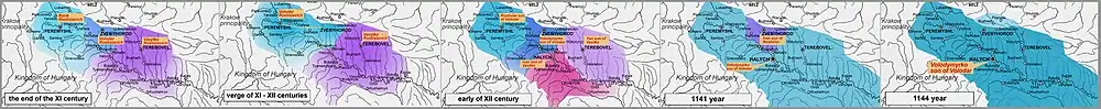 За правління Святоплука І (871–894) деякі племена хорватів увійшли до складу Великої Моравії, а після її занепаду галицькі землі частково потрапили під вплив польських і угорських правителів, хоч і частково продовжували існувати як незалежні князівства з центрами, зокрема, в Теребовлі та Стільському[2]. У 993 році після другого походу київського Володимира Святославича на хорватів, частина Галичини була включена до складу Київської Русі. Утім, уже в 1018 році польський король Болеслав I Хоробрий захопив і приєднав галицькі землі до Польщі. Упродовж кількох наступних десятиліть Галичина почергово опинялася під владою київських князів та польських королів.
