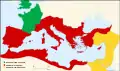 - "зеленим" позначено Галльську імперію, "жовтим" - Пальмірську імперію (260—273), "червоним" - власне Римську імперію