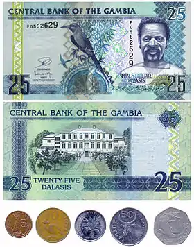 У готівковому обігу перебувають банкноти номіналом в 1, 5, 10, 25, 50, 100 даласі. Банкноти одного номіналу мають по декілька модифікацій (серій випуску), тому в обігу на території Гамбії перебувають не 6 видів купюр, а понад 20.
