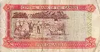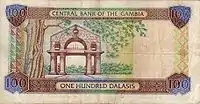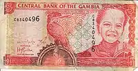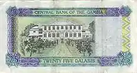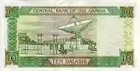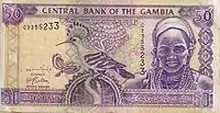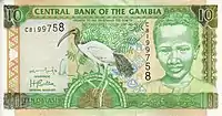 10 Даласі | 138 х 72 | Ібіс (Threskiornis aethiopicus) та портрет хлопчика | Будівля Центрального банку Гамбії (на банкнотах ранніх випусків — дослідницька станція) |