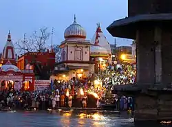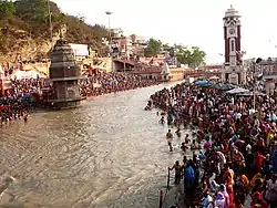 Далі Ганг протікає повз місто Харідвар, де річка вперше виходить на Індо-Гангську рівнину, а від неї відходить Гангський канал. Традиційно Харідвар вважається одним з найважливіших центрів паломництва на річці. Місто грає важливу роль як для вайшнавітів, так і для шайвістів, власне його назва може перекладатися як «Брама Вішну» (в написанні «Харідвар») або «Брама Шиви» (в написанні «Хардвар»)[31][32]. Вважається, що Вішну залишив у місті слід своєї ступні, коли сам здійснював обмивання у водах Гангу[32]. Також за легендою, це одна з чотирьох ділянок, де небесний птах Ґаруда пролив зі свого глека еліксир безсмертя амріту, через що на них проводиться найбільший індуїстський фестиваль — Кумбха-Мела або «фестиваль глеків».