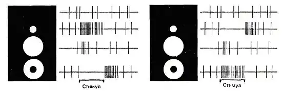 В 1950 році Стівен Куффлер вперше зареєстрував реакції гангліозних клітин сітківки на світлові плями у кішки. Куффлер відводив ці реакції внутрішньоклітинними електродами, які вводились через склеру безпосередньо в сітківку з передньої сторони. Знаходити гангліозні клітини неважко, оскільки вони лежать на поверхні сітківки і мають порівняно великі розміри.