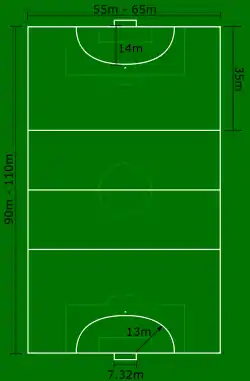 Ігра проходить на трав'яному полі розміром завдовжки 90-110 м, завширшки 55-65 м. Поле перетинає дві паралельні лінії за 35 м від лінії воріт, які розділяють поле на 3 секції; У кожній секції може бути до 6 гравців кожної команди. Ворота - завширшки 7,32 м і заввишки 2,44 м. Пенальті б'ють з відстані 14 м.